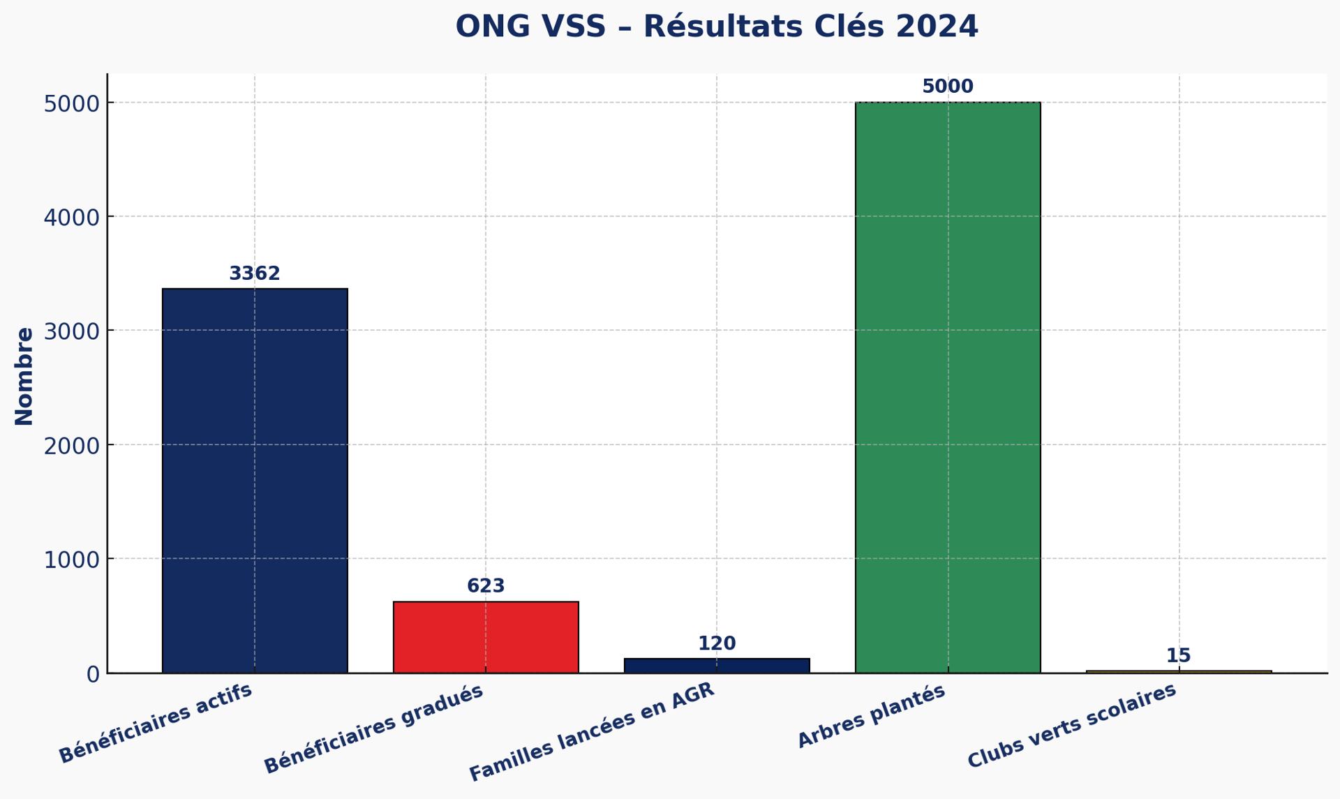 660 bénéficiaires à graduer jusqu’à fin septembre 2024, à ce jour nous avons 623 bénéficiaires gradués (120 femmes ; 36 Hommes ; 223 filles ; 244 garçons) de 127 ménages, représentant 94,39 % de l’objectif.